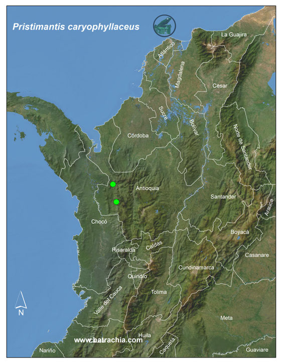Nombres anteriores (sinonimia): Syrrhopus caryophyllaceus Barbour, 1928;Eleutherodactylus caryophyllaceus Dunn, 1937;Pristimantis caryophyllaceus Heinicke, Duellman & Hedges, 2007.