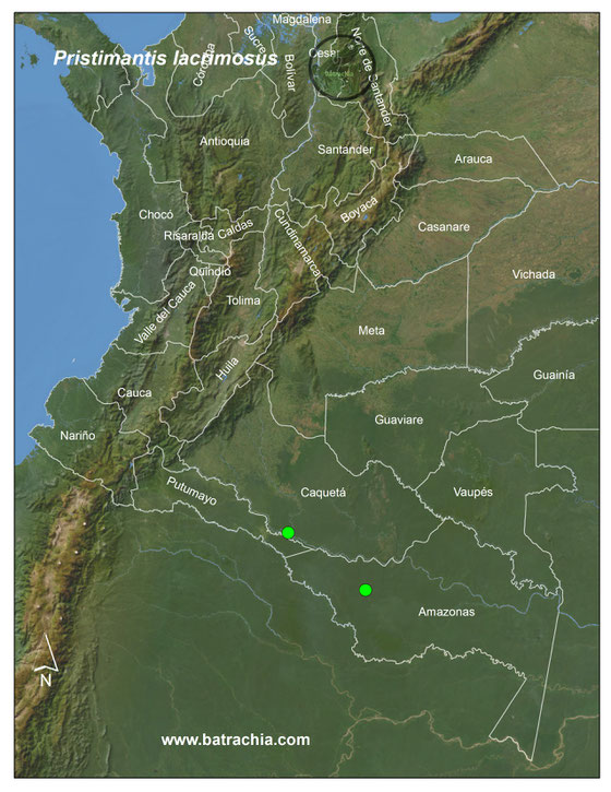 Selvas húmedas tropicales del trapecio Amazónico con registros en el departamento de Caquetá (Lynch & Schwartz, 1971;Lynch, 1980;Heyer & Hardy, 1991; Ruiz et al. 1996;Acosta, 2000;Lynch, 2007) entre los 100-200 metros sobre el nivel del mar.